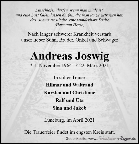 „Es gibt keinenAbschied für diejenigen,die in Gott verbunden sind.“Liebe Familie Joswig, der Tod von Andreas hat uns sehr betroffen gemacht. Wir sprechen unsere Anteilnahme aus! Familie Ossenkopp